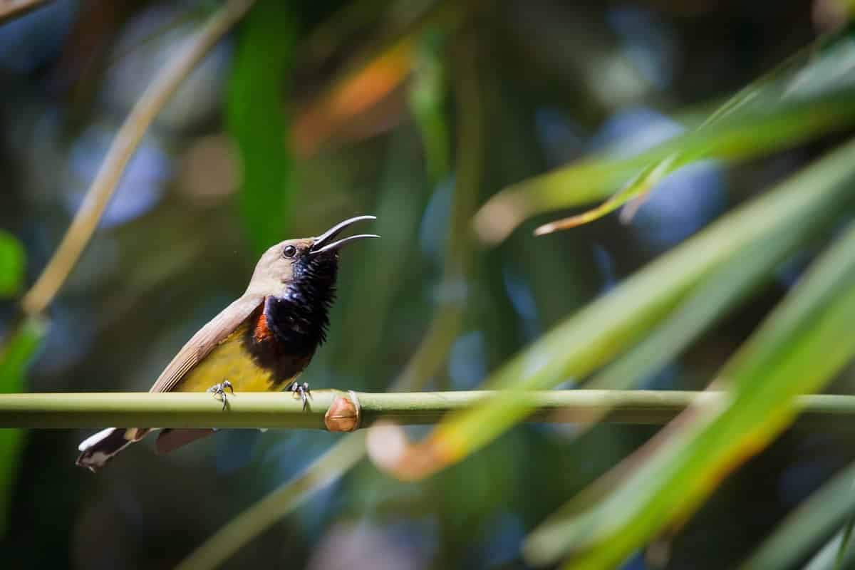 The Olive-backed sunbird, also known as the yellow-bellied sunbird, is a small bird in Nectariniidae Family. They are small in size at around 12 cm long. The under parts of both male and female are bright yellow and the backs are a dull brown colour. Their forehead, throat and upper breast of the adult male is a blue-black. Their flight is fast and direct on their short wings. Even though, they are listed as Least Concern by IUCN they are protected in Thailand in accordance with the Wildlife Preservation and Protection act 1992.