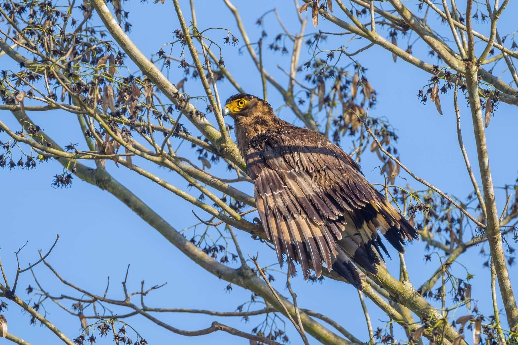 The crested serpent eagle is a medium sized bird of prey living in forested habitats of tropical Asia. It is dark brown in color and the head appears quite large, with long feathers on the back, hence the name crested. The tail has wide white and black bars on it and the feet are very powerful, in order to keep hold of its prey.