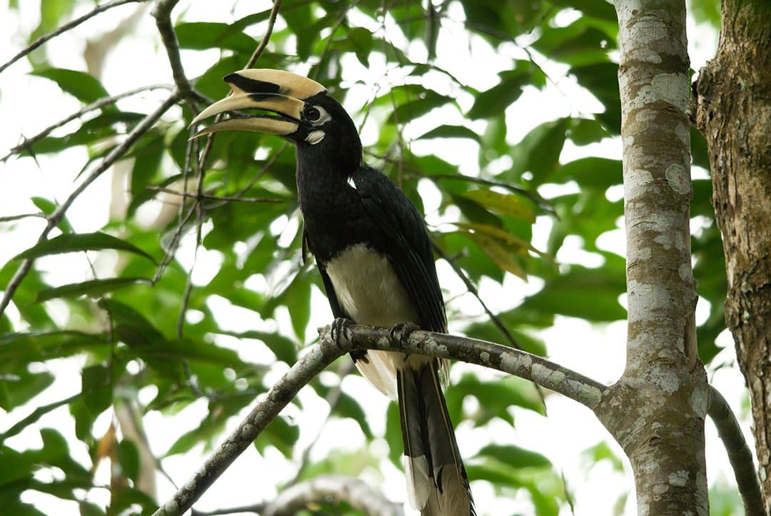 The oriental pied hornbill is a medium size bird with a head-to-tail length of 55-60 cm and a wingspan of 23-36 cm. The bill measures 19 cm for males and 16 cm for females. They can weigh between 600 g and 1,050 g, averaging 900 g for males and 875 g for females. The plumage of the head, neck, back, wings and upper breast is black with a slight green. The tail is black with white tips on all the feathers except the central feathers. The plumage of lower breast, belly, thighs, under-wing and all the tips of the wings is white. Males and females are similar in coloration. Males can be distinguished from females by their larger body size, yellow bill which has black base and bright red eyes. They are listed as ‘Least Concern’ by IUCN Red List.