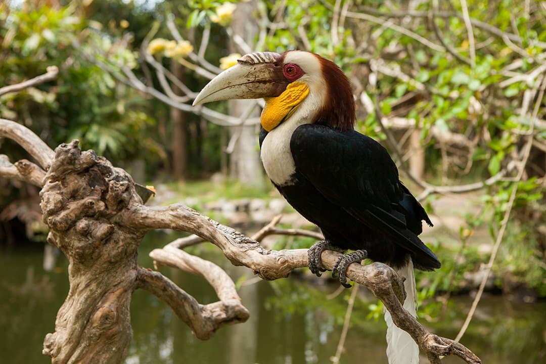 The wreathed hornbill, also known as the bar-pouched wreathed hornbill, is around 75-100 cm in length. Males weigh from 1.8 – 3.65 kg while females weigh from 1.36 – 2.7 kg. Both sexes are similar to the respective sexes of the closely related plain-pouched hornbill, but the wreathed hornbill can be recognized by the dark bar on the lower throat. They have black backs, wings and belly. Males have a creamy head with reddish plume from the nape and a naked yellow gular pouch with a distinct black stripe. Females are distinguished by a black head and neck and blue gular pouch. They are listed as ‘Least Concern’ by IUCN Red List.