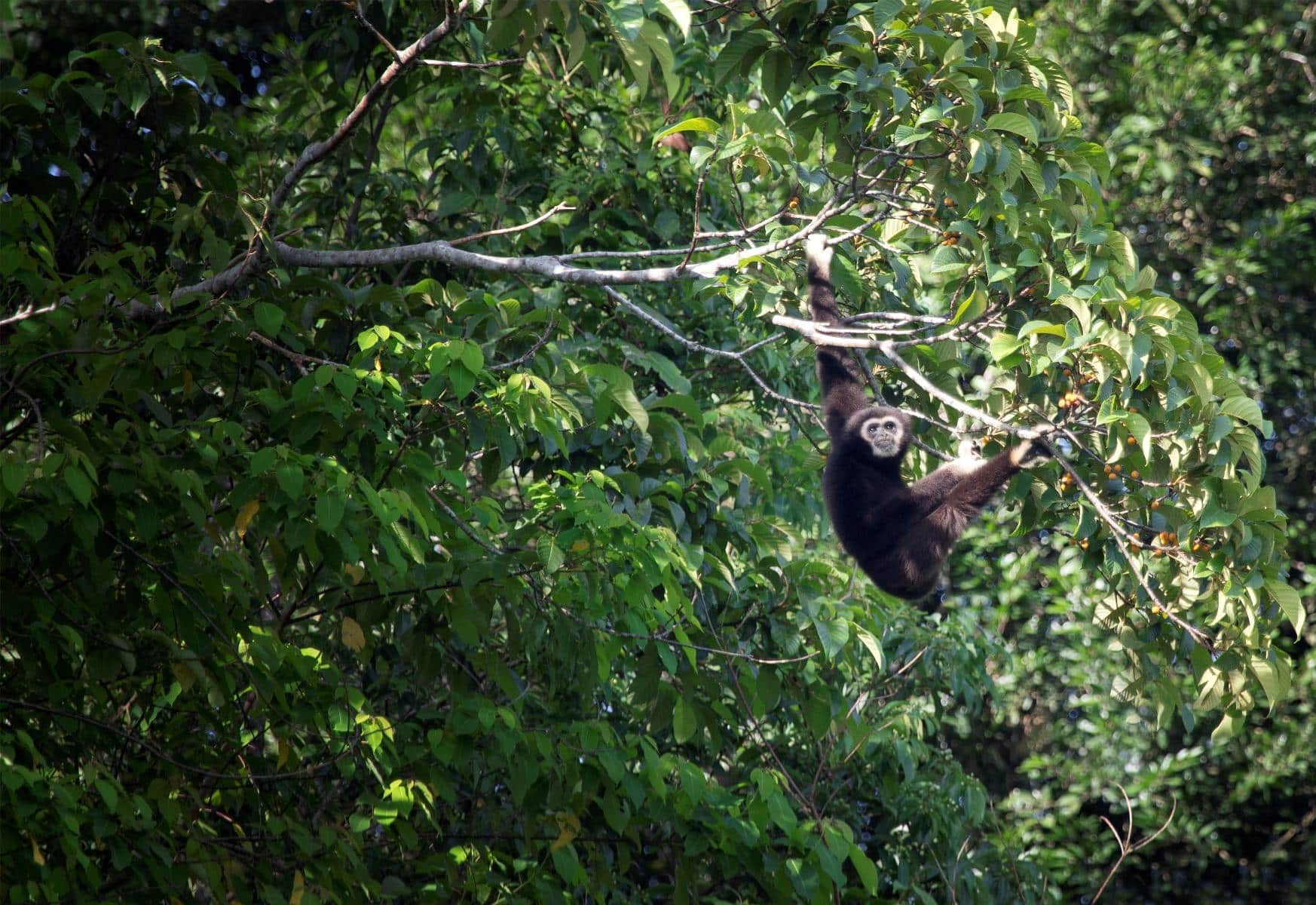 Gibbons are not very easy to see, because they spend most of their life high up in the canopy – but they are easy to be heard. Gibbons call as a way of marking territory and warning family members about predators. Songs vary from males to females. Gibbons have no tail which is one reason why they are not considered monkeys but apes. They have long arms, enabling them to brachiate (swing) between tree branches. A gibbon can brachiate at speeds as high as 55km/h (35 mph) and can travel as far as 9 m (30 feet) in one swing. Most other primates simply jump between branches. Gibbons have a lifespan of about 44 years ‘endangered’ on the IUCN Red List.