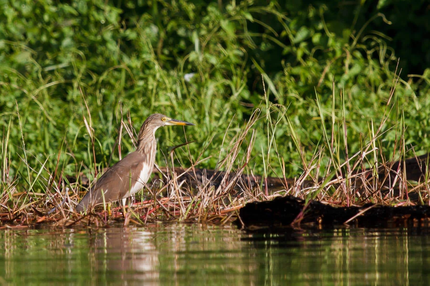 The Chinese pond heron is a freshwater bird from the heron family and is commonly found in tropical and subtropical East Asia and China. When standing on the ground, it is well camouflaged, having brownish grey colored upper plumage. When flying, however, the white wings appear and the bird is easily seen. The eyes, the bill and the legs are yellow. It is a solitary bird, sometimes seen in pairs or small groups of 5 to 6 individuals. The pond heron is a migratory bird, spending the summers in East Asia and moving to China in winter.